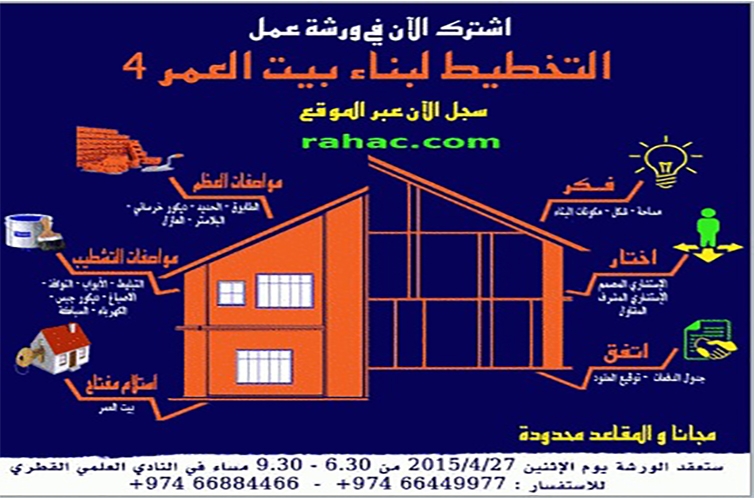 تعلن راحة للتجارة والمقاولات عن دعوة الجمهور للتسجيل مجاناً لحضور ورشة عمل حول كيفية التخطيط لبناء بيت العمر
